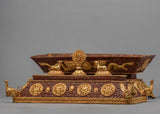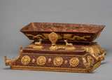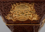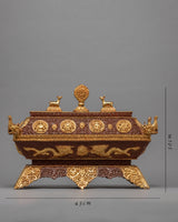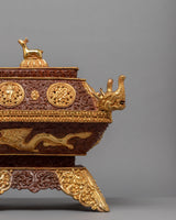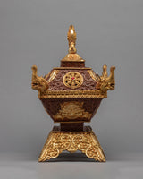 This holy object is made even more magnificent and elegant by its gold-plated finish, which elevates it to the status of a magnificent complement to any altar or hallowed area. An indispensable instrument in Tibetan ceremonies, the incense burner is a container for prayers and offerings that fills the space with peace and calm. This incense burner reflects the spiritual essence of Tibetan Buddhism, inviting practitioners to connect with the deity and achieve inner serenity, whether used in elaborate rituals or as part of private meditation practices.