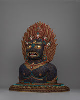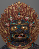 Bhairva is a Hindu deity associated with destruction and protection. He is often depicted as a fierce and powerful figure with fierce expressions and prominent fangs. In Tibetan Buddhism, Bhairva is considered a protector deity and is revered for his ability to conquer negative forces and bring blessings to his devotees. He is also associated with the Buddhist principle of non-attachment, as he is said to have transcended all attachment to worldly desires and emotions. Bhairva is considered a deity of great power and is often invoked for protection and overcoming life obstacles. He is often depicted in Tibetan Buddhist art, such as statues and masks, and is a popular subject of devotion and meditation for many Buddhists.