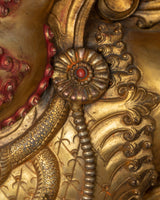 Garuda is also admired for his capacity to control Nagas (serpent deities), making him a protector from sickness, poisons, and evil influences. In Tibetan Buddhism, displaying a Garuda wall hanging in homes, temples, or sacred areas is thought to bring protection, courage, and spiritual development. Whether utilized for ceremony or as an artistic exhibition of the Buddhist tradition, this handcrafted gold-gilded Garuda wall decor represents divine protection and spiritual empowerment.