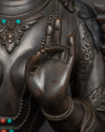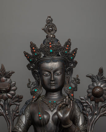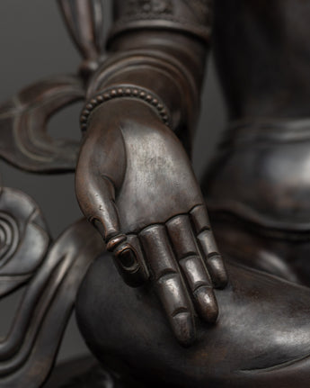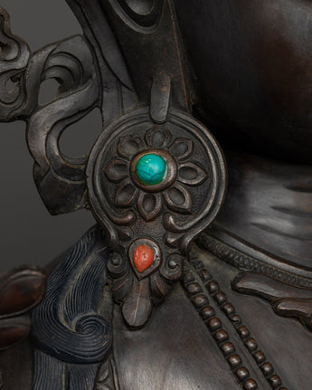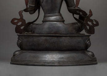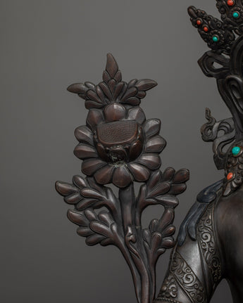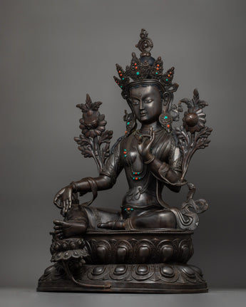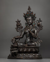 Green Tara is depicted with elegance and compassion, seated in a ready stance with one leg outstretched to respond quickly in times of need. Her right hand is in the varada mudra, indicating infinite giving, while her left hand is holding a utpala lotus, which represents purity and spiritual enlightenment. The oxidized copper body accentuates her heavenly and protecting the aura, making this statue an effective spiritual instrument for evoking Tara's blessings of protection, compassion, and direction on the path to enlightenment.