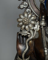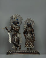 The statue of Lord Krishna and Radha is a stunning piece of art made of oxidized copper with silver plating that exudes elegance and heavenly appeal. The statue is 86 cm tall and has elaborate craftsmanship with a focus on minute details. The figurines stand smoothly on a wonderfully designed rectangular base embellished with circular and embossed decorations. This foundation not only offers structural support but also adds to the overall beauty of the item.
