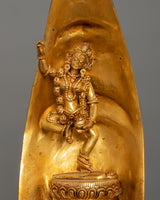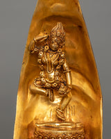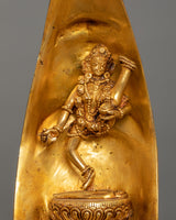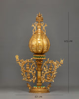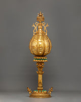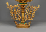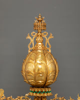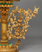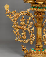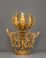The lotus is delicately held in the center, supported by two flowing flower carvings that form an S-shaped design. These carvings feature four deities, each symbolizing auspicious symbolism, adding to the object's holiness. The sun and moon appear at the tops of each side, representing wisdom and method, respectively. The utilization of these heavenly emblems represents balance and the dual nature of life and spiritual activity. At the bottom of this masterpiece, two deities, each with a serpent wrapped around their head, stand on the lotus petals, grounding the entire structure. The base and upper sections are unified in a harmonic design, and the deities represent protection and spiritual power. This piece is a unique blend of superb craftsmanship, symbolism, and spiritual depth, intended to be a powerful focal point in any sacred setting.