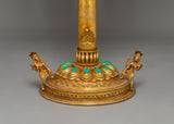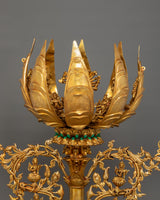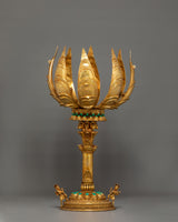 This handcrafted gold-plated lotus statue, 103cm tall and 60cm wide, is a gorgeous portrayal of the sacred lotus flower. In Buddhism, the lotus symbolizes purity, enlightenment, and spiritual awakening. Crafted from high-quality copper with a dazzling gold-plated finish, this stunning piece weighs 28.94kg. It is a significant centerpiece for temples, meditation areas, or spiritual home decor. Including turquoise inlays heightens its spiritual significance, symbolizing wisdom and protection.