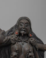 Standing with one foot resting atop a reclining figure—a representation of Lord Shiva—is Mahakali. This position represents the breakdown of the ego and her power over evil forces. With a curved sword (khadga) uplifted in her right arm, she is symbolizing the ability to vanquish ignorance and impediments. She is holding a severed human head in her left hand, which represents the ego's demise and the soul's liberation from material bonds.