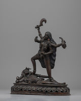 The base of the statue is carefully carved, giving a strong basis and boosting the artistic qualities of the artwork. The statue appears old and has a sense of veneration because of its oxidized copper body. This statue is a beautifully crafted work of religious art as well as a symbolic depiction of Mahakali's transforming and protective powers.