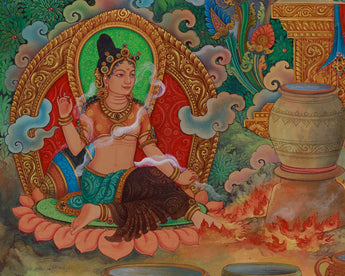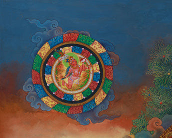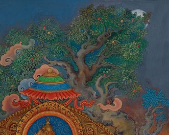 The artwork features Jamana Gubaju on a lotus throne, a bell, and a vajra, symbolizing the delicate balance between compassion and wisdom. Surrounding him, the Vajrayogini Mandala pulses with sacred feminine energy. At the same time, the majestic Shambhunath Stupa rises in the background, grounding the piece in the rich spiritual heritage of the Kathmandu Valley. The intricate details, from the mandala to the celestial garments, invite the viewer into a world where artistry and spirituality converge.