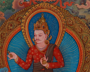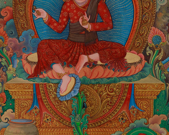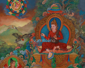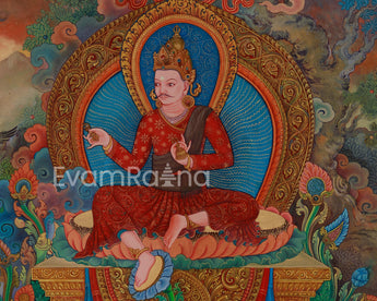 This print features the original Jamana Gubaju thangka, a revered Mahasiddha from the Kathmandu Valley who transcended earthly boundaries to attain profound wisdom and peace. The vibrant print honors his journey, capturing the essence of his spiritual power and connection to tantric Buddhism, showcasing his profound wisdom and peace.