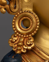 The deity's attire is expertly crafted, with every contract and carving on the Tibetan texts captured with accuracy and richness. The elaborate designs on the robes are intricate and varied, each one gilded and etched to catch the light and create a hypnotic play of luminance. The artwork's spiritual gravity is further enhanced by the contrast between the deep blue hairline and the golden crown. Embedded gemstones in shades of red, greenish-purple, light purple, and white lend a layer of brightness and rich symbolism to the piece.