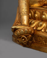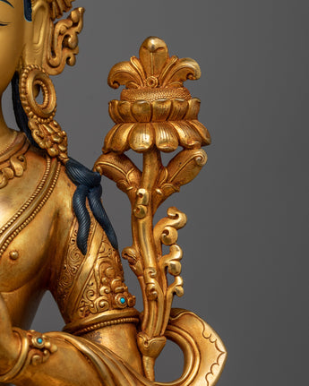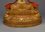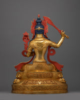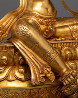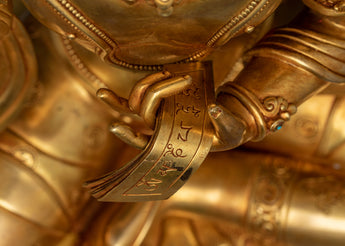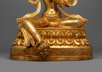 This exquisitely made "Manjushri: An Insight Wisdom Deity" statue will inspire and enhance any spiritual or intellectual area. It is the personification of enlightened wisdom. Measuring 20.7 inches in height, this spectacular sculpture is crafted from premium copper and lavishly covered in 24K gold, showcasing the magnificent the intricate details of Manjushri's holy garments and his dynamic stance. The monument is an entrepreneurial homage to Manjushri, the bodhisattva linked to transcendent wisdom. He is seen clutching a Tibetan textbook, which represents the wisdom of Buddhist teachings, and brandishing a fiery sword to slay ignorance.