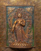 A metal thangka is a type of thangka painting that is made on a metal surface rather than on traditional canvas or paper. Metal thangkas are often made using copper, brass, or silver and are usually decorated with intricate designs and Buddhist iconography using a technique called repoussé. This involves hammering the metal from the reverse side to create a raised relief image on the front. Metal thangkas are known for their durability and are often used in ritual contexts or as decorative pieces in Buddhist homes and temples. They are particularly common in Tibet, where they have been produced for centuries.