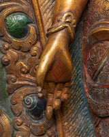 Traditional thangka painting methods are combined with the use of a metal canvas to create the intriguing type of art known as Metal Thangka Art. This work of art, which is handcrafted on a metal frame, features minute details and expert craftsmanship. The deity statue that serves as the focal point of the Metal Thangka Art is expertly constructed and rendered. The artwork's overall beauty and impact are enhanced by the special visual effect created by the shiny metal surface. This type of art invites visitors to investigate the rich history and profound teachings of Tibetan Buddhism in addition to providing a visual treat.