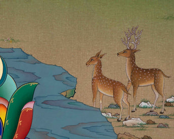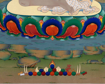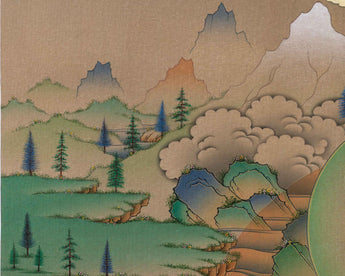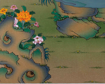 The Life of Milarepa Thangka Print is a masterful hand-painted piece on cotton canvas using all-natural stone colors. In the thangka, Milarepa sits on an animal skin inside a mountain cave, with a peaceful expression on his face. His left-hand clasps a skull cup while his right-hand rests on his right ear in a listening gesture. The verdant green foliage and bright red flowers surrounding the cave provide a serene atmosphere, pleasing to the practitioner. This thangka is perfect for regular meditation, Buddhist rituals, and even home décor. Genuine 24K gold has been incorporated to add to the deity's features and provide a finishing touch.