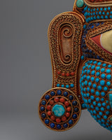 The inlaid stones of turquoise, coral, lapis lazuli, and conch shell—each selected for its symbolic meaning—amplify the mask's spiritual importance. Lapis lazuli is thought to symbolize wisdom and truth; conch shells are connected to divine awakening; turquoise is thought to provide protection and tranquility; and coral denotes power and vitality. These stones give the mask more visual appeal, but they also transform it into a multicolored, deeply symbolic spiritual treasure.