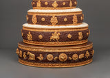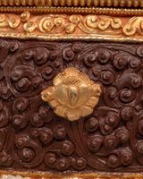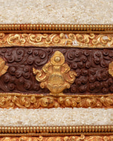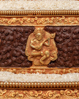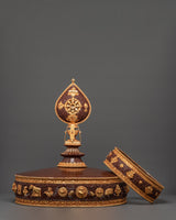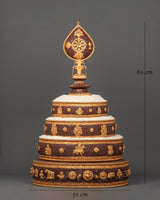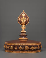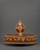 Each layer's mandalas are meticulously carved with auspicious symbols and deities, and the top features a Dharma wheel. A long-life skull vase is carved at the base, with a Dharma wheel sandwiched between the layers. The mandala has lovely floral carvings. The top and bottom of the mandala's foundation are gold-plated, while the middle area is oxidized.