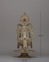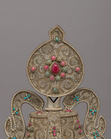 This stunning Tsebum Long Life Vases is handmade from sturdy copper and electroplated with a smooth silver finish, highlighting excellent creativity and ancient Tibetan symbolism. These ceremonial vases, 35 cm tall and 19 cm wide, are intricately embellished with filigree designs and symbolic symbols representing longevity and spiritual wealth. The vases' bases and bodies are decorated with intricate carvings, featuring delicate flower and filigree motifs that highlight their cultural and aesthetic worth.