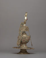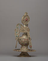 This pair of Tsebum vases, created as a ceremonial item, is historically used in Tibetan Buddhist ceremonies to represent the desire for a long and happy life. However, their exquisite craftsmanship and rich details make them ideal as beautiful centerpieces for home altars or display cabinets. The set weighs 2.77 kg, with each vase weighing 1.38 kg, assuring its stability while exuding beauty and spiritual meaning. This one-of-a-kind set is a monument to Tibetan workmanship and would make an excellent addition to any holy or artistic collection.