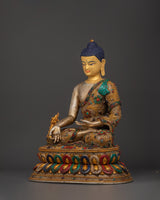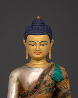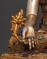 The statue is made of copper and plated with gold and silver. It flows with elegance and meticulous craftsmanship. The judicious use of artificial stones, such as coral and turquoise, enhances their spiritual meaning while also increasing their overall beauty and value. This serene image of the Medicine Buddha, often associated with compassion and healing, can be used in meditation to enhance inner serenity and well-being. This piece, whether displayed on an altar, in your living room, or your meditation area, will promote peace and spiritual well-being.
