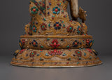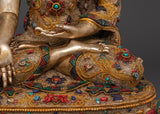 This finely carved Peaceful Medicine Buddha Sculpture will provide serenity, healing, and balance to your house. Standing at 46.5 cm tall, this magnificent piece boasts delicate filigree work and bright gold plating, making it a remarkable addition to any religious space. The statue is artistically embellished with valuable stones, including coral and turquoise, which are thought to provide protection, healing, and tranquillity. This Medicine Buddha sculpture represents health, wisdom, and the ability to heal both physically and spiritually.