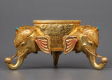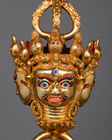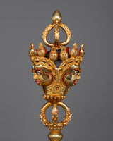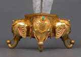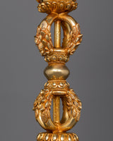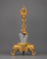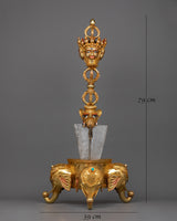 The Phurba Ritual Set with Stand is a notable artifact from Tibetan Buddhist tradition. Handcrafted with meticulous care to detail, it has a copper body covered with exquisite designs and rich 24k gold plating. This combination of materials and craftsmanship not only adds to its aesthetic appeal, but it also conveys a sense of solemnity and reverence.