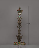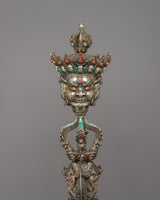 This artistically carved Phurba, made of silver, contains a Heruka in the center and a skull head crown inlaid with gemstones. The Heruka's eyes are also decorated with gemstones representing spiritual insight and heavenly power. The Phurba has a Bishowa Vajra beneath its head, representing the essence of spiritual potency. A curved knife emerges from the mouth of a Makara, which has two finely carved horns, adding to its protective connotation. The Vajra is exquisitely ornamented with gemstones, and the three Vajra sides are covered with skull-like carvings, each in a single-petal lotus shape that represents the balance of life and death. The Vajra has turquoise engravings on each tip, which adds to its beauty and brilliance. Another Makara is carved beneath the Vajra, with three-edged swords protruding from its mouth, representing the destructive power that removes obstructions on the spiritual path. Two snakes slither downhill from the Makara's mouth, interweaving and symbolizing duality and metamorphosis. The careful craftsmanship and gemstone intricacies throughout the necklace add to its mystical energy and spiritual importance.