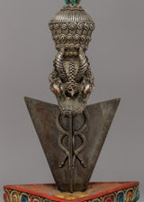 The Phurba is stable on a hardwood base fashioned in the shape of a double-petal lotus. The base's colorful design adds to the item's overall visual impact. This Phurba is a ceremonial tool and a captivating work of art. Each feature is carefully designed to represent spiritual protection, transformation, and the great energies in Tibetan Buddhist practice.