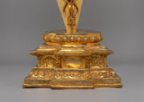 The thone, carved in the shape of flames around the figure, highlights the intense, transformative energy central to the Hayagriva-Phurba deity. This flame motif represents the burning away of opposing forces and obstacles. The statue's base is meticulously carved with floral designs, symbolizing purity and the flourishing of life amidst the fierce energy. The vibrant gold plating complements the copper body, enhancing the sacred nature of the Phurba while giving it an ornate, regal finish ideal for ritualistic use or display in a spiritual space.