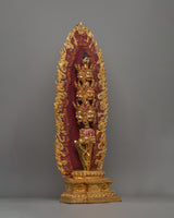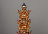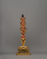 This Phurba with throne craft stands 81 cm in height and 29 cm in width and weighs 7.866 kg. It is an intricate representation of Buddhist Hayagriva in the Heruka form, embodying powerful, wrathful energy. Crafted from copper and finished with gold plating, this piece features beautifully detailed nine angry faces, each symbolizing a different aspect of wrath and transformative energy. Amitabha Buddha's head is crafted at the top of the phurba with the other 9 Heruka heads below, adding a layer of compassion to this fierce figure. The Phurba, a traditional ritual dagger, is often used to cut through illusions and negativities symbolically, and in this representation, it is elevated with extraordinary craftsmanship.