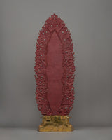 The Phurba's presence is commanding, with its eight faces giving it a sense of authority and power characteristic of Heruka, a deity representing the wrathful aspect of compassion. This unique depiction integrates Buddhism's wrathful and compassionate qualities, presenting a balance that resonates deeply with practitioners. The overall design emphasizes the protection and transformation offered by this deity, and its flame-like halo further intensifies the symbolic meaning behind this powerful Buddhist artifact.