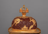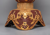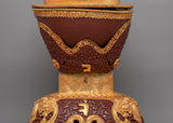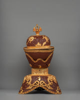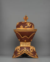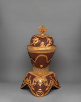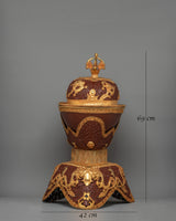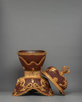 A respected Buddhist ritual item utilized in Vajrayana practices, this Ritual Bowl Kapala Set is 69 cm tall and 42 cm wide. This ceremonial bowl, which reflects the profound spiritual traditions of Tibetan Buddhism, is made from oxidized copper and electroplated with gold. It has been decorated with elaborate carvings and fortunate motifs. The elegant lid adorned with dragons and holy patterns further enhances its significance as a sacred cup in tantric offerings, meditation, and ceremonies.
