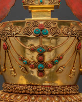 This Ritual Stupa for Shrine is an extraordinary Tibetan Buddhist monument representing the enlightened mind of the Buddha. Standing 88cm in height and 44cm in width, and weighing 15.44kg, this stupa is crafted from a copper body with radiant gold plating and adorned with coral and turquoise stones. Intricately carved with Vajra motifs and featuring sacred symbols such as the Deer and Dharma Wheel inside, this stupa embodies the essence of spiritual awakening and the eternal turning of the Dharma.