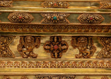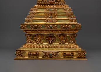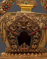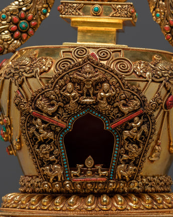 In Buddhist tradition, a stupa symbolizes the enlightened state and serves as a vessel of blessings and merit. The Vajra carvings represent indestructible truth and spiritual power, while the Dharma Wheel and Deer recall the Buddha’s first teaching at Deer Park, marking the spread of wisdom and compassion. The gold plating radiates purity and divine energy, and the turquoise and coral stones add protective and healing significance. This monumental stupa is not only a powerful ritual item but also a centerpiece of Himalayan artistry, making it ideal for temples, shrines, and serious practitioners.
