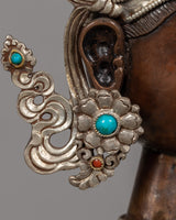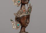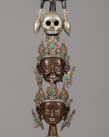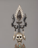 This Khatvanga staff is more than just a pretty relic; it is a deep instrument utilized in Tibetan Buddhist ceremonies to signify divine energy and deity protection. It is an effective meditation technique for practitioners, allowing them to connect with higher spiritual realms while embodying the teachings of impermanence and freedom. Its exquisite form and meticulous details elevate it from a useful ritual object to a piece of art that honors Himalayan craftsmanship's long legacy.