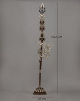 The Sacred Khatvanga Staff for Buddhist Rituals is a unique ceremonial relic with tremendous spiritual importance. Standing at an astonishing height of 194.5 cm, with a breadth of 36 cm and a weight of 8.01 kg, this ceremonial staff exemplifies superb workmanship and profound symbolic importance. The staff is made of copper and has a delicately electroplated silver surface, giving it a brilliant, antique finish that adds to its mystical air.