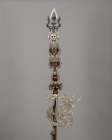 The upper part of the staff is embellished with intricate carvings and symbolic features, including multiple heads representing various spiritual states or deities. A skull design represents impermanence and the cyclical aspect of existence, while rich decorations with intricate patterns show the quality of the workmanship. The presence of flowing cloths carved from silver surrounding the central area provides an ethereal sense, representing transcendence and spiritual elevation. The base is solid and broad, assuring stability during ceremonial usage, and has an antique finish that symbolizes the piece's historical and spiritual validity.