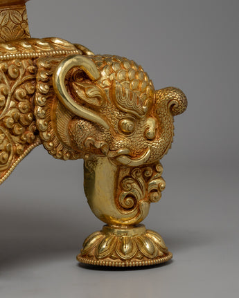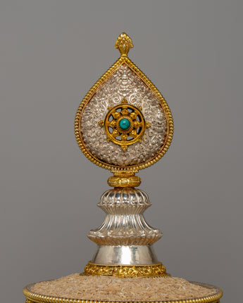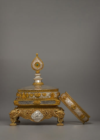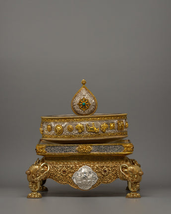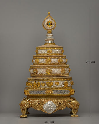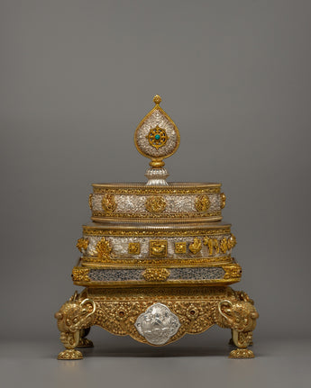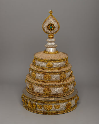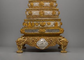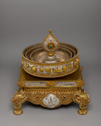 The mandala has layers of elaborate decoration, with each increasing tier decorated with symbolic symbols representing the holy Buddhist universe. The gold-plated highlights accentuate the delicate carvings, while the pure silver pieces add a bright brilliance representing the sacred goal. The foundation is supported by finely sculpted lion sculptures representing strength and protection. The mandala's summit is topped with a teardrop-shaped decorative pinnacle, which adds to the majestic grandeur of this offering set.