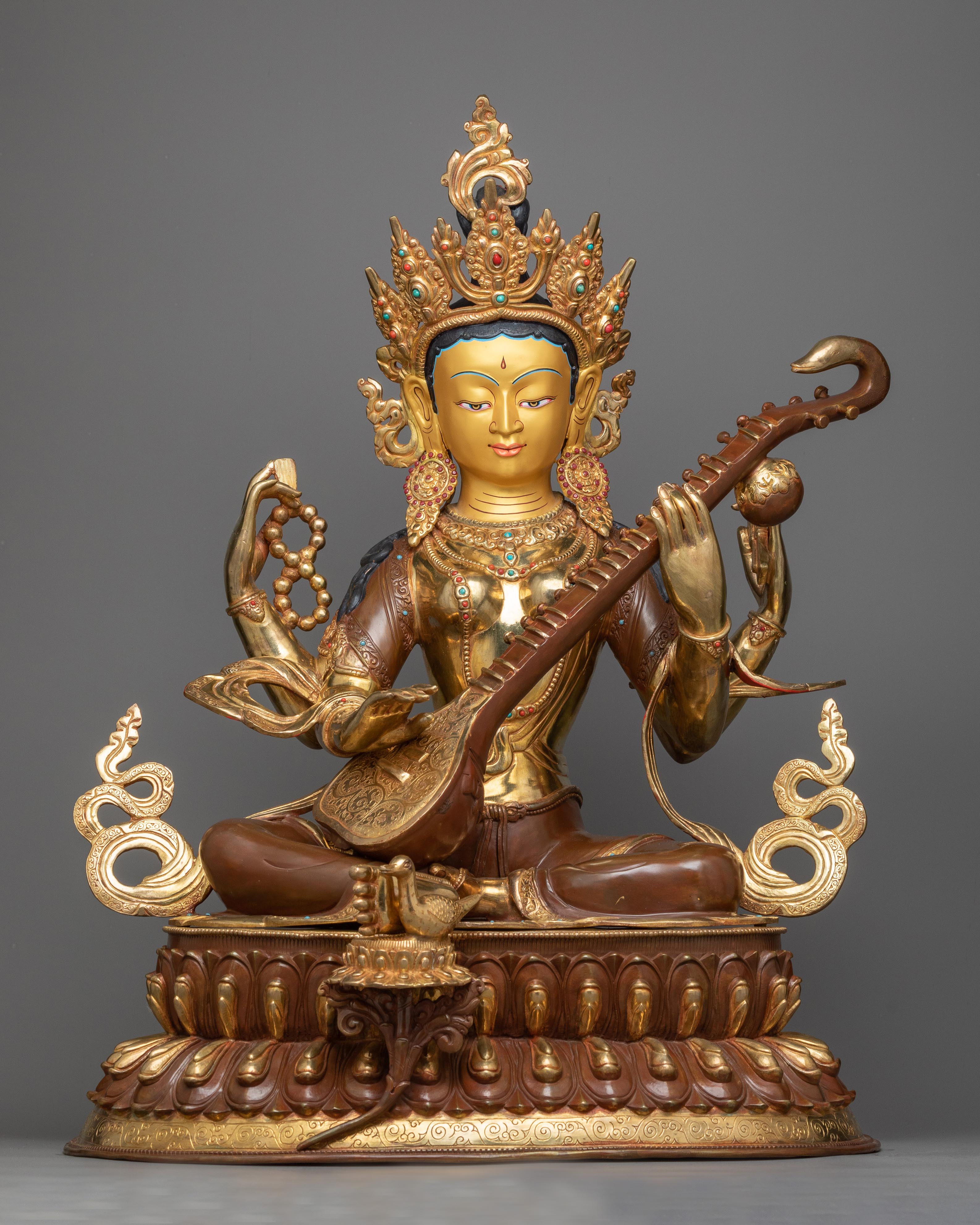 Saraswati Sculpture | 24K Gold Gilded Grandeur of Knowledge and Arts