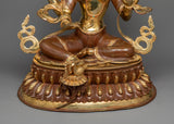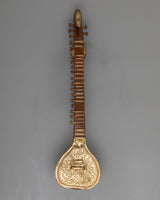 The sculpture is wonderfully fashioned from oxidized copper, giving it a timeless and refined appeal. The dark, deep tones of the oxidized copper provide an ideal backdrop for the statue's brilliant 24K gold plating. This beautiful gold finish, along with precise gold and acrylic paints, brings out the complex intricacies of Saraswati's body, from her graceful posture to the sacred instruments she carries.