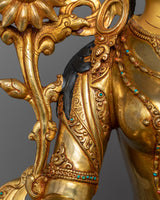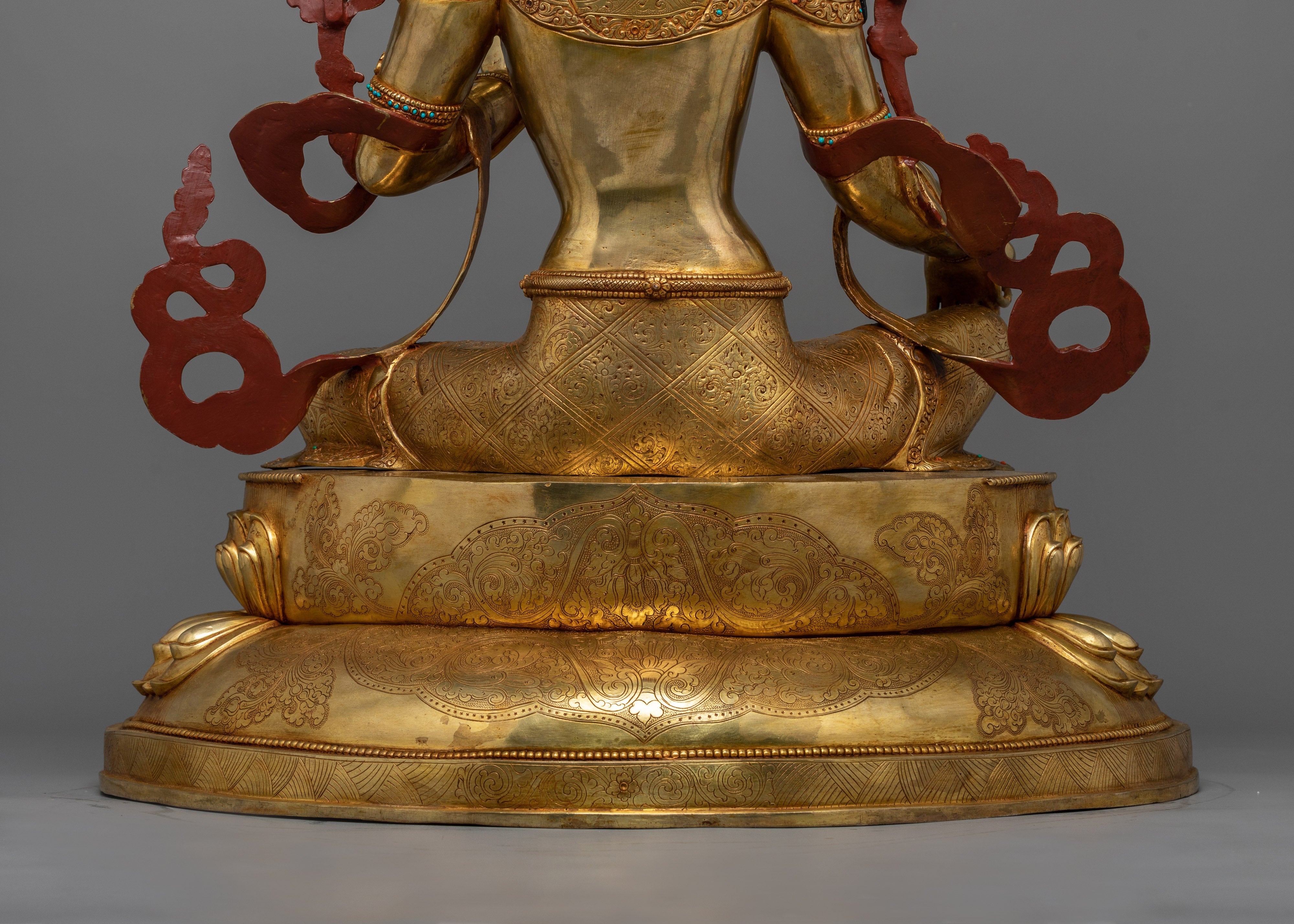 Introducing the massive sculpture of Green Tara, the female Bodhisattva of compassion, activity, and protection—the Serene Green Tara. Standing at an astounding height of 28.7 inches, with a base measuring 21.2 inches and a weight of 28.91 kg, this sculpture is a powerful representation of Green Tara's kind nature and constant willingness to help people in need. Made with a copper body and 24K gold plating, it is further embellished by intricate paintings in gold and acrylic that represent Green Tara's limitless compassion and protective grace.