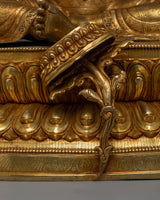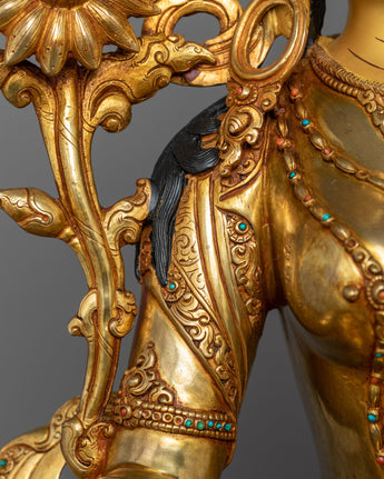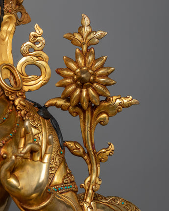 With one leg extended forward, symbolizing her readiness to act for the good of her followers, Green Tara is seen in her well-known stance. Her hands are in the protective and wish-granting mudras, each holding a lotus, representing purity and spiritual power. The 24K gold gilding splendidly highlights her divine form, casting a warm, inviting glow that enriches any spiritual or contemplative setting. The intricate gold and acrylic paintings bring to life her compassionate gaze and the elaborate details of her robes, inviting meditation and reflection on the virtues of empathy, healing, and protective care.