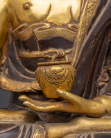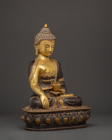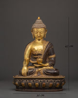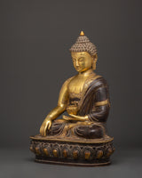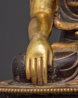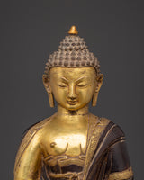 This Shakyamuni Buddha Statue for Spiritual Healing and Peace is a stunning work of spiritual art, made of oxidized copper and finished with bright gold plating. This remarkable sculpture provides a tranquil presence in any sacred area. The statue is expertly crafted using the repousse method, highlighting its intricate details and superb craftsmanship. The Buddha's golden hue contrasts brilliantly with his darker, oxidized copper robe, accentuating Shakyamuni Buddha's spiritual radiance. This statue is perfect for meditation rooms, Buddhist shrines, or as a spiritual decor element. It embodies serenity, knowledge, and enlightenment.