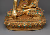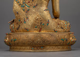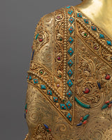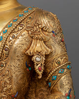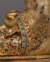 Shakyamuni Buddha Statue of Enlightenment sculpture, gilded in triple layer 24K gold, with deeply engraved 3D-like carving, and intricate acrylic & gold paintings, is a work of art and a vessel of profound philosophical importance. Each detail, from the soft drape of the robes to the serene look of meditative repose, is created with the highest care onto a solid copper body. This piece is a fitting tribute to those on the spiritual path, seeking a deeper connection with their practice and a reminder of the serenity that mindfulness can bring.