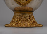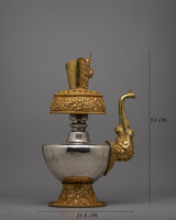 This Buddhist ritual object, known as a Bhumba Set, is made of copper body and Pure Silver which is Plated with gold. This Bhumba Set is a significant and wonderfully crafted work, measuring 51 cm in height, 31.5 cm in width, and weighs 9.28 kg. The mix of silver and gold plating gives it a remarkable appearance, representing cleanliness, divinity, and the sacred nature of the rites it is used for.