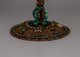 In Tibetan Buddhism, the Tibetan Silver Axe holds great cultural and spiritual significance as a ceremonial weapon. It is a handcrafted piece of pure silver that perfectly captures the traditional attention to detail and craftsmanship that define Tibetan art. With original gemstones including turquoise, coral, lapis lazuli, and conch shell stones—all of which have symbolic value in Tibetan culture—the 42.5-cm-tall axe boasts a distinctive appearance.