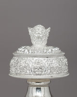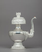 This ceremonial water vase features beautiful engravings and carved elements that reflect traditional Tibetan craftsmanship. The finely polished silver surface and delicate carvings heighten its spiritual significance, while the beautiful lid and bent spout increase its visual and symbolic value. The spout, which is commonly formed like a dragon or legendary entity, depicts the flow of wisdom and sacred energy, emphasizing its importance in purifying and protection rituals.