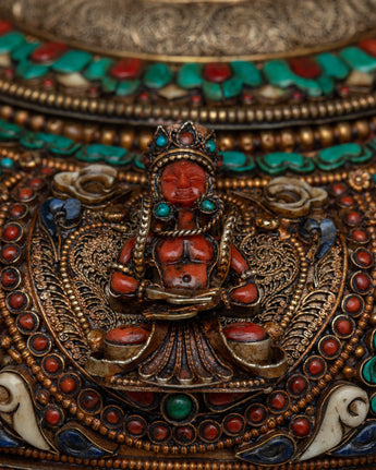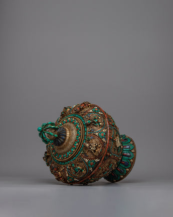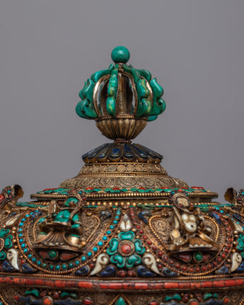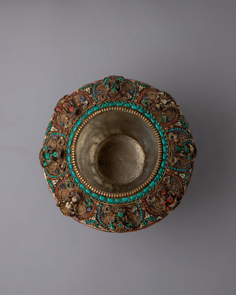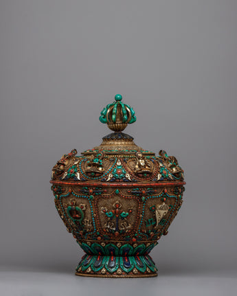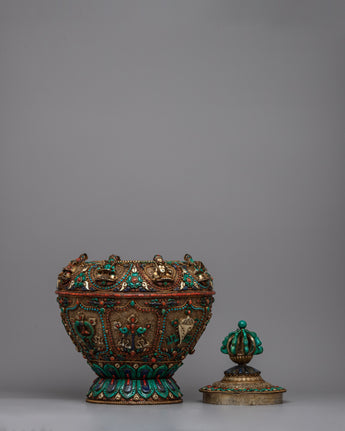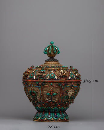 The exquisitely crafted Silver Dhupur Rice Pot is a work of art, crafted by hand from premium silver. This exquisite pot, which stands an astounding 36.5 cm tall, is embellished with original inlaid turquoise, lapis lazuli, coral, and conch shell, each of which brings a striking splash of color and elegance. The pot's surface is covered in exquisite carvings of various gods and holy symbols that exhibit extraordinary craftsmanship and elevate it above simple decoration to the status of a work of art with a rich cultural history.