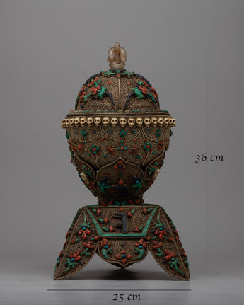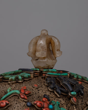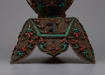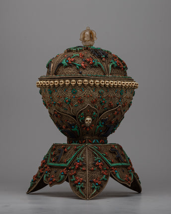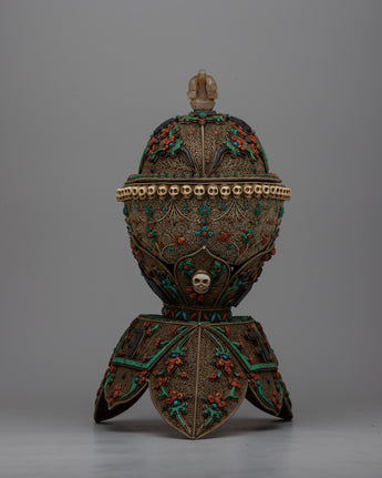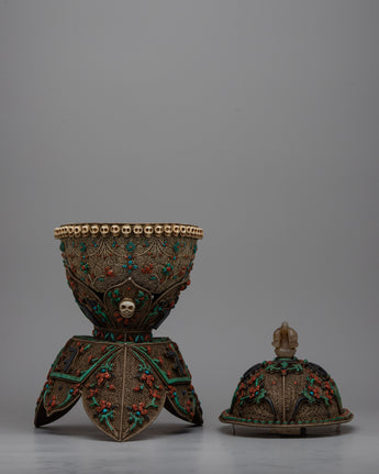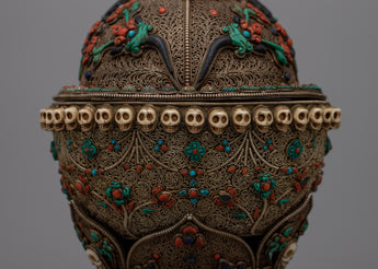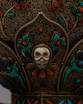 The Skull Cup, adorned with turquoise, coral, and lapis lazuli stones, exudes brilliant colors that represent deeper connotations in Tibetan culture. These skillfully inlaid stones not only add to its visual appeal, but also represent spiritual characteristics like as wisdom, compassion, and clarity.