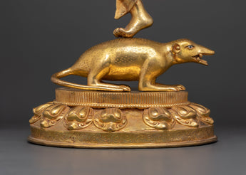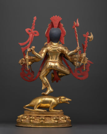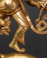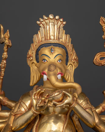 This majestic standing Rakta Ganesh statue stands at 21.3 inches tall, exuding a commanding presence. His radiant golden body, highlighted with intricate gold and acrylic paintings, embodies energy and dynamism, while the 24K gold gilding adds a sacred and luminous glow to the piece. Ganesh is depicted in a standing posture, ready to remove obstacles and bring forth prosperity and success, with multiple hands holding symbolic items such as a vajra and an axe, representing his ability to cut through difficulties.