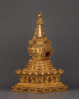 A stupa with gold-plating stands 83.5cm tall as a Buddhist emblem of the awakened mind. It is made of copper and features genuine turquoise and coral stones, reflecting centuries of Himalayan spiritual heritage and artisan mastery. Every feature, from the intricately etched base to the brilliant spire, incorporates significant symbolism, each representing a different component of the path to enlightenment, such as knowledge, compassion, and all-encompassing unity.
