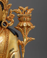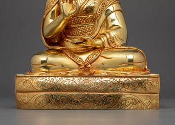 Introducing the Guru Rinpoche Set, a depiction of three pivotal figures in Tibetan Buddhism: Guru Rinpoche (Padmasambhava), Trisong Detsen, and Santaraksita. They contributed significantly to the spread of Buddhism in Tibet. This set demonstrates their common spiritual legacy with excellent craftsmanship. The Guru Rinpoche statue measures 15.4"/39cm tall with a base width of 9.8"/25cm, while Trisong Detsen and Santaraksita are 12.2"/31cm x 8.7"/22cm and 12.4"/31.5cm x 8.5"/21.5cm, respectively. The set, weighing 13.18 kg in total, is precisely made from copper bodies, gilded in 24K gold, and embellished with beautiful gold and acrylic paintings.