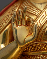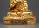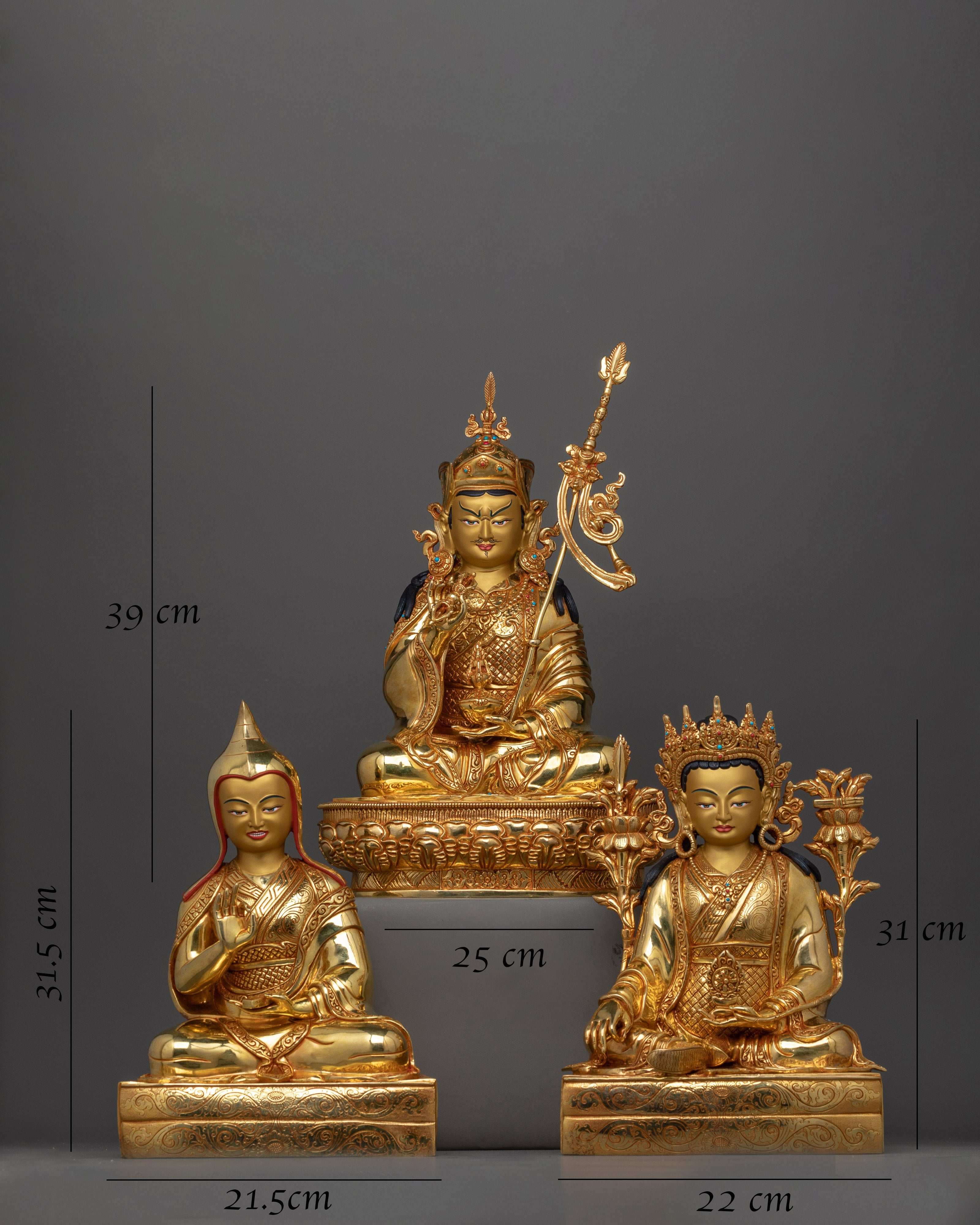 Guru Rinpoche, also known as Padmasambhava, is central to this set, flanked by King Trisong Detsen, the Dharma King who invited Guru Rinpoche to Tibet, and Santaraksita, the great scholar and monk who helped establish Buddhism's philosophical foundations. Together, they represent the union of wisdom, power, and monastic discipline essential for the spread of Buddhism. The gold gilding highlights their divine forms, casting a luminous aura that enriches any spiritual or contemplative space. The intricate gold, Deeply engraved carvings, and acrylic paintings bring depth to their expressions and the elaborate details of their robes, inviting meditation and reflection on the path to enlightenment.